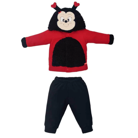Todo em microsoft super macio e quentinho, a blusa possui capuz em pelinho com bordado da carinha da joaninha e anteninhas em relevo, é muita fofura!