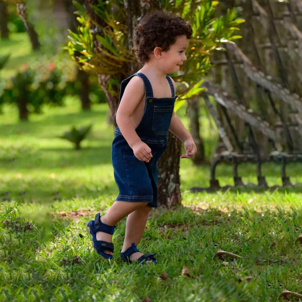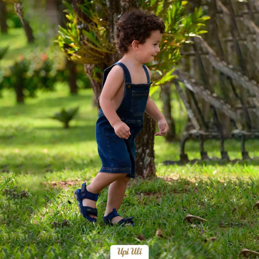 Jardineira jeans, tecido macio e confortável, com bolso frontal.