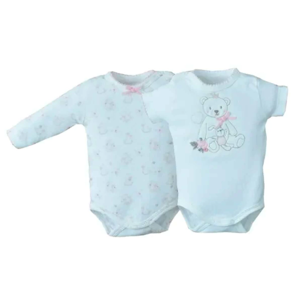 Um verdadeiro mimo para o enxoval da bebê! O kit com dois bodies em suedine macio traz delicadeza e conforto para o dia a dia. Um modelo com estampa suave de ursinha e coelhinha e o outro com bordado localizado, ambos pensados para oferecer praticidade e aconchego nos primeiros meses.