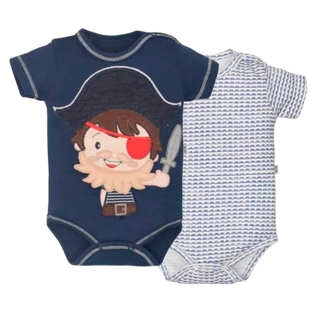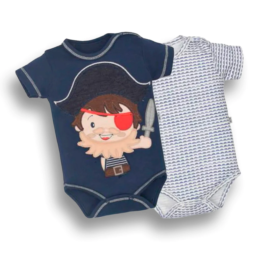 Conforto em dobro para as aventuras do seu pequeno! Este kit com 2 bodies é ideal para vestir o bebê com praticidade e muito charme no dia a dia. O body azul marinho traz um bordado frontal de pirata super divertido, perfeito para os pequenos exploradores. Já o body branco com listras em tons suaves completa o kit com um visual leve e versátil. Ambos possuem modelagem confortável, botões de pressão no entrepernas e tecido macio, garantindo liberdade de movimentos e bem-estar em todos os momentos.