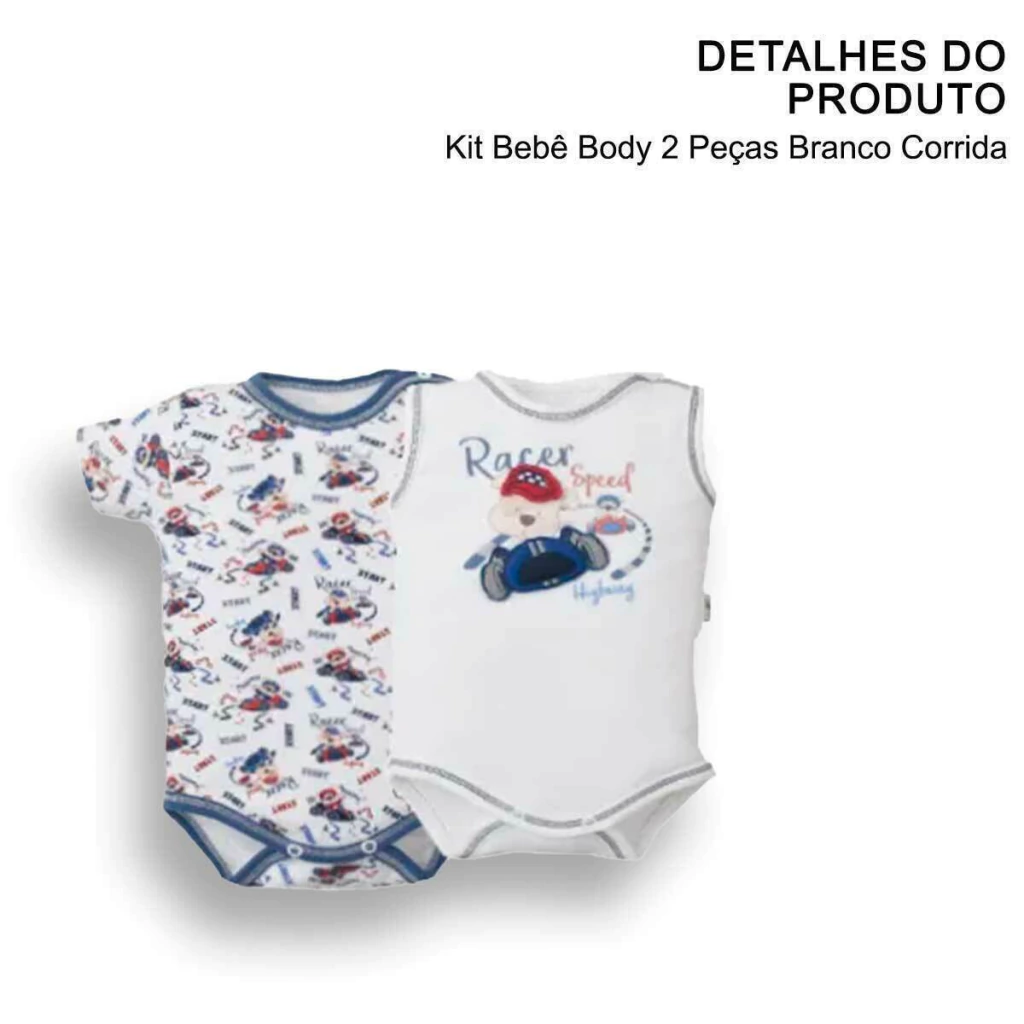 Perfeito para os pequenos aventureiros, esse kit com dois bodys traz o charme do universo das corridas em versões estampada e bordada. Confeccionados em malha suedine, garantem conforto e liberdade de movimento para o bebê em qualquer ocasião.