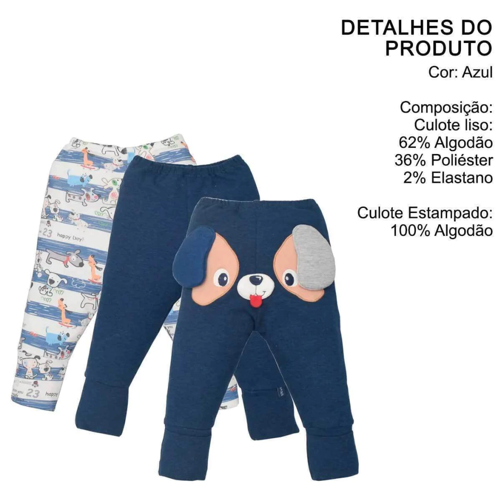 Esse kit é a combinação perfeita de fofura e praticidade! Confeccionado com tecidos macios e confortáveis, o conjunto conta com dois culotes: um modelo com estampa digital (toque zero) de cachorrinhos superdivertida, e outro liso azul marinho com bordado em alto-relevo de carinha de cachorro no bumbum — incluindo orelhinhas aplicadas e focinho bordado. Ambos possuem elástico suave na cintura e pé reversível, ideais para manter o bebê aquecido e livre para se movimentar.