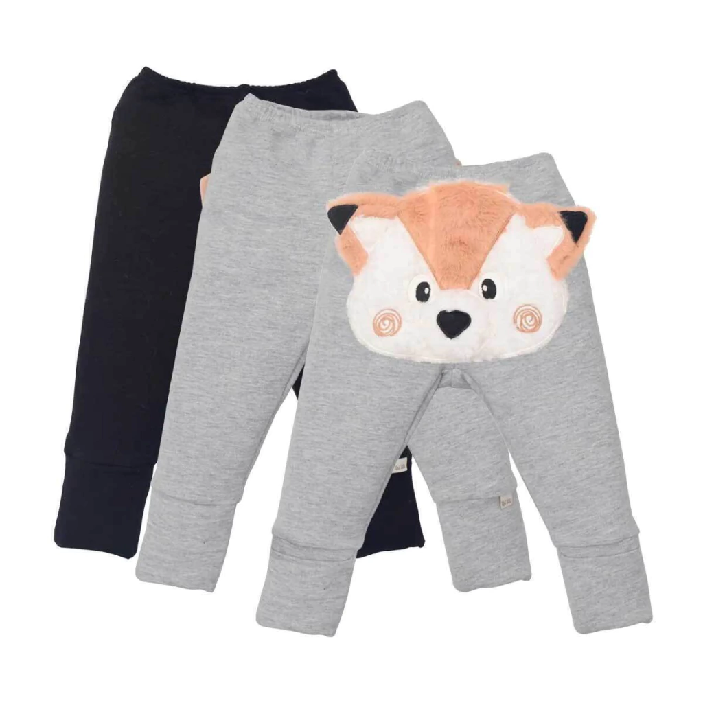 Além de super confortável, esse kit de culotes é puro charme! Confeccionado em soft comfort com toque macio, ele é ideal para aquecer os bebês com praticidade. O modelo cinza conta com um bordado em pelúcia no bumbum em formato de bichinho com orelhinhas e focinho em relevo — um verdadeiro encanto! Já o modelo preto é básico, versátil e ideal para o dia a dia. Ambos possuem elástico na cintura e pé reversível, garantindo conforto e ajuste perfeito.