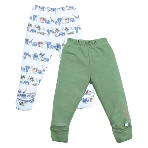 Ideal para momentos de aconchego e diversão, o kit com duas calças oferece conforto e estilo para o dia a dia do bebê. Uma das peças traz um delicado tom verde com bordado de girafa, enquanto a outra encanta com uma estampa alegre de animais da savana, como elefantes e girafas. Com elástico na cintura e punho dobrável, as calças proporcionam ajuste ideal e liberdade de movimentos.