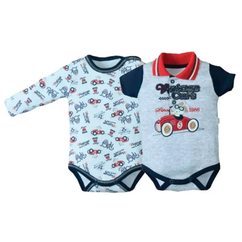 Com um toque retrô e cheio de estilo, o kit com dois bodys é ideal para deixar o pequeno confortável e pronto para aventuras! Um deles traz a clássica estampa corrida de carrinhos vintage, enquanto o outro modelo simula uma camisa polo com gola listrada e bordado aplicado de carrinho, puro charme!