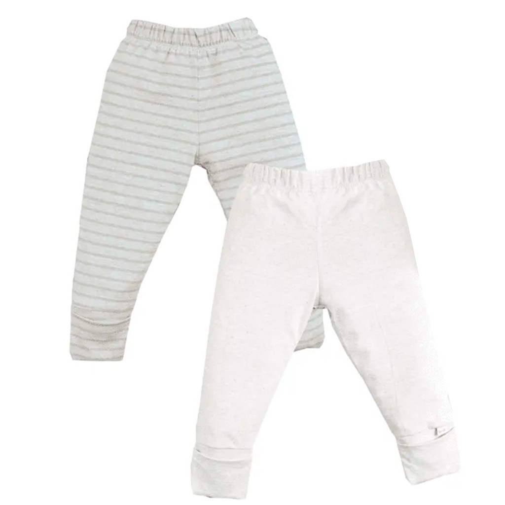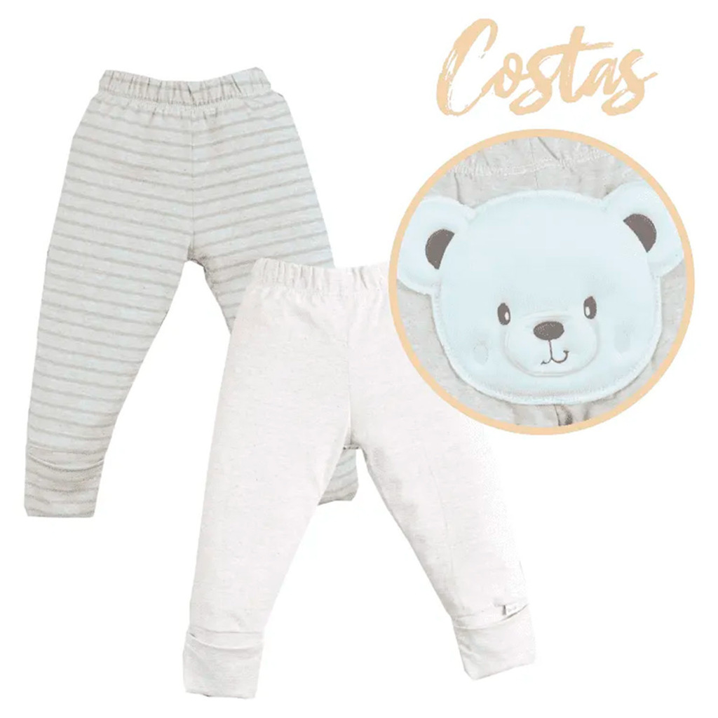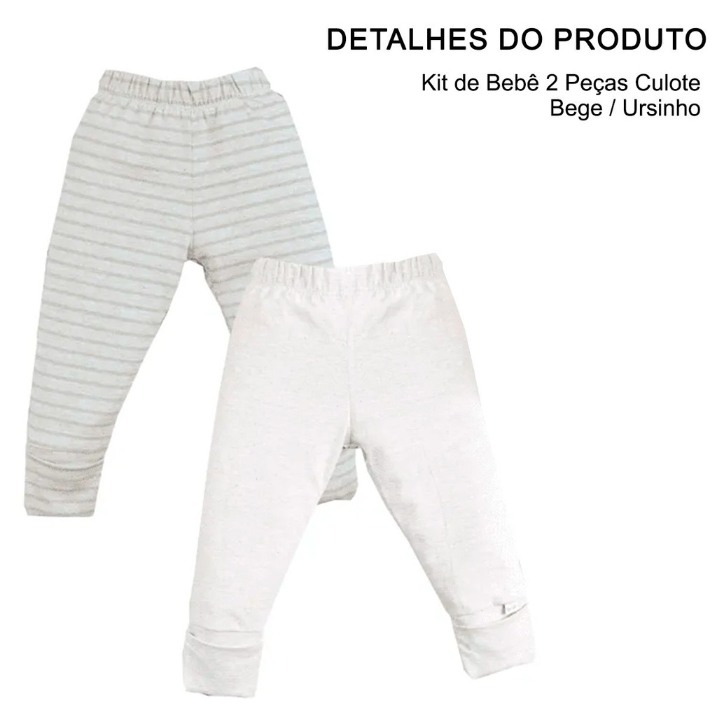 Conforto e fofura se encontram neste kit de calças com temática de ursinho. Uma das calças é bege lisa, com detalhe encantador de rostinho de urso aplicado na parte de trás, enquanto a outra vem com estampa listrada em tons neutros, ideal para compor looks delicados e aconchegantes para o dia a dia do bebê.