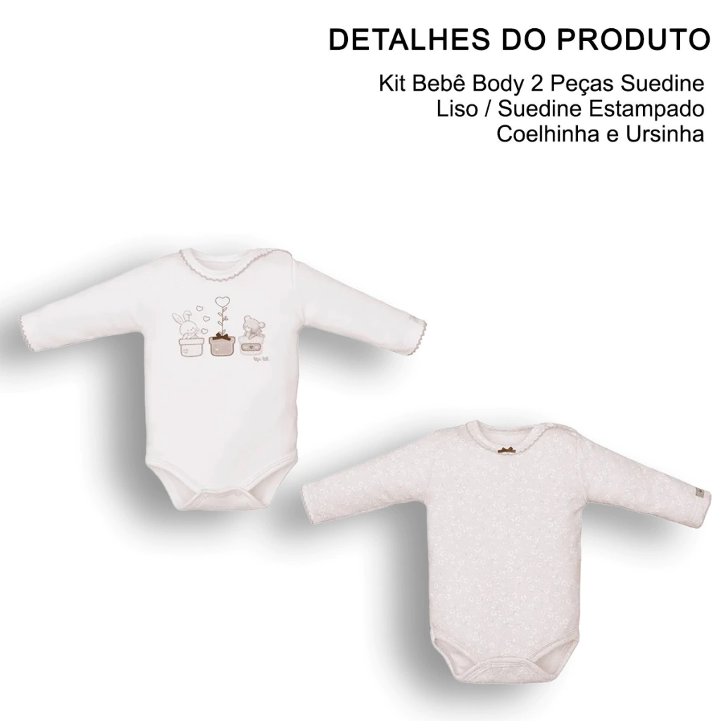 Delicadeza e praticidade em dobro! Este kit de bodys manga longa é ideal para o dia a dia do bebê, oferecendo conforto com um toque de charme. Ambos confeccionados em suedine macio, garantem aconchego e liberdade de movimento. Um dos bodys traz estampa frontal super fofa de coelhinho e ursinho, enquanto o outro é liso na mesma tonalidade marfim, perfeito para combinar com diversas peças.