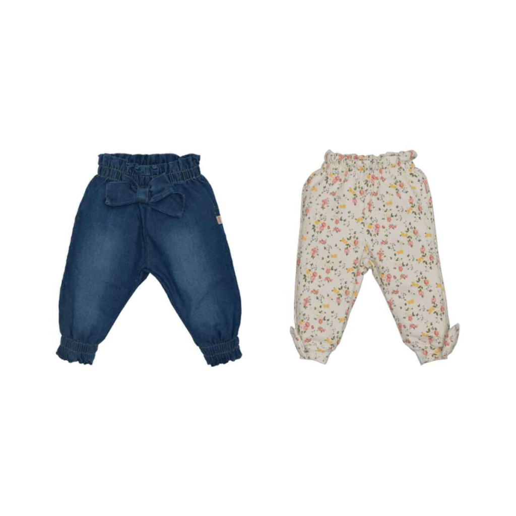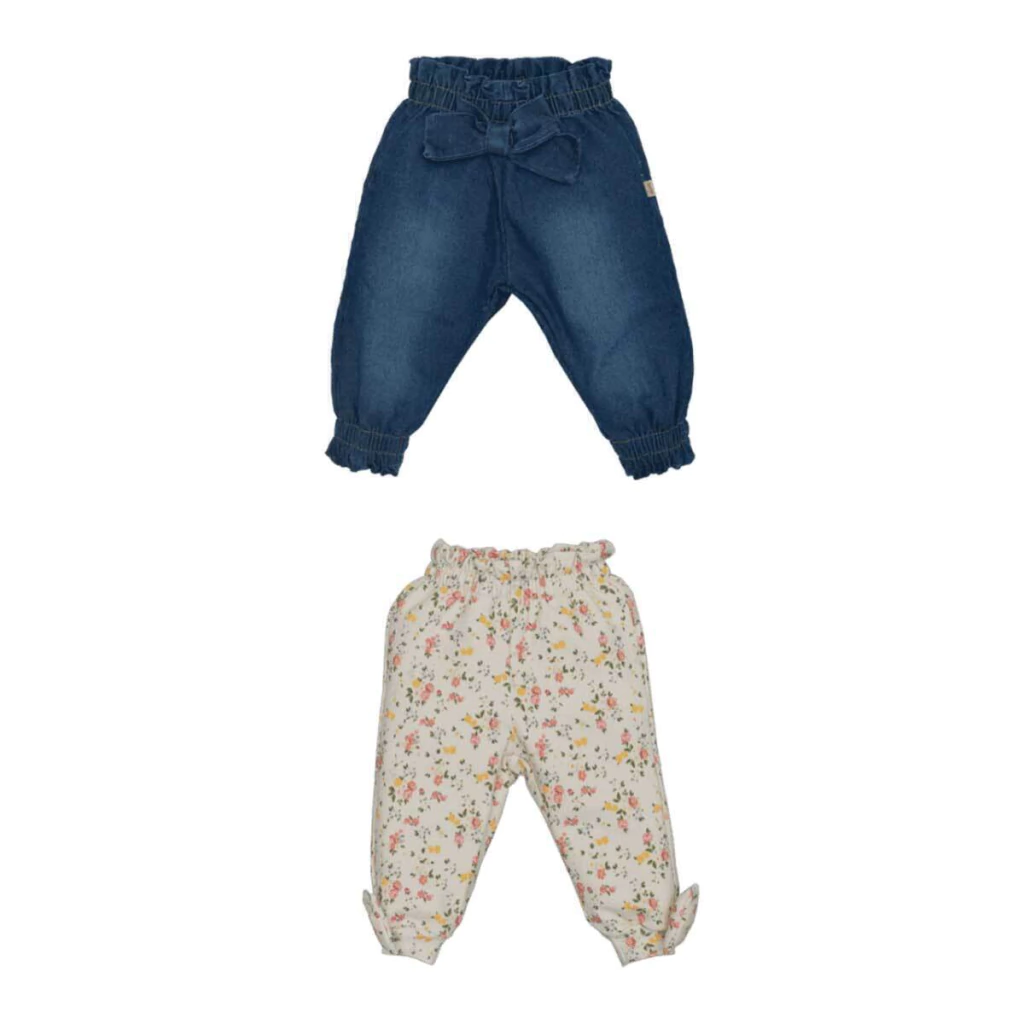 Conjunto de culotes com tecidos suaves e delicados, perfeitos para garantir conforto e estilo para o bebê. O conjunto combina estampas florais e um toque de jeans, com detalhes charmosos de laços e acabamentos práticos.