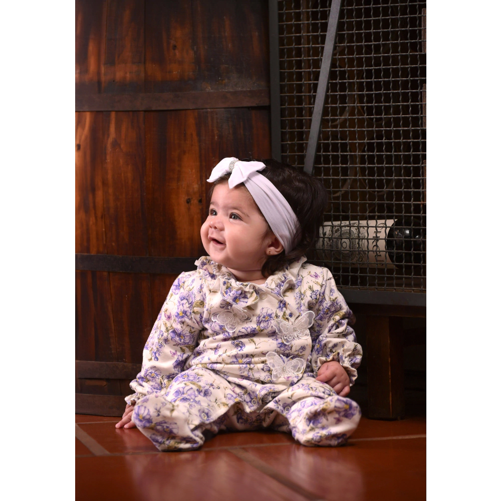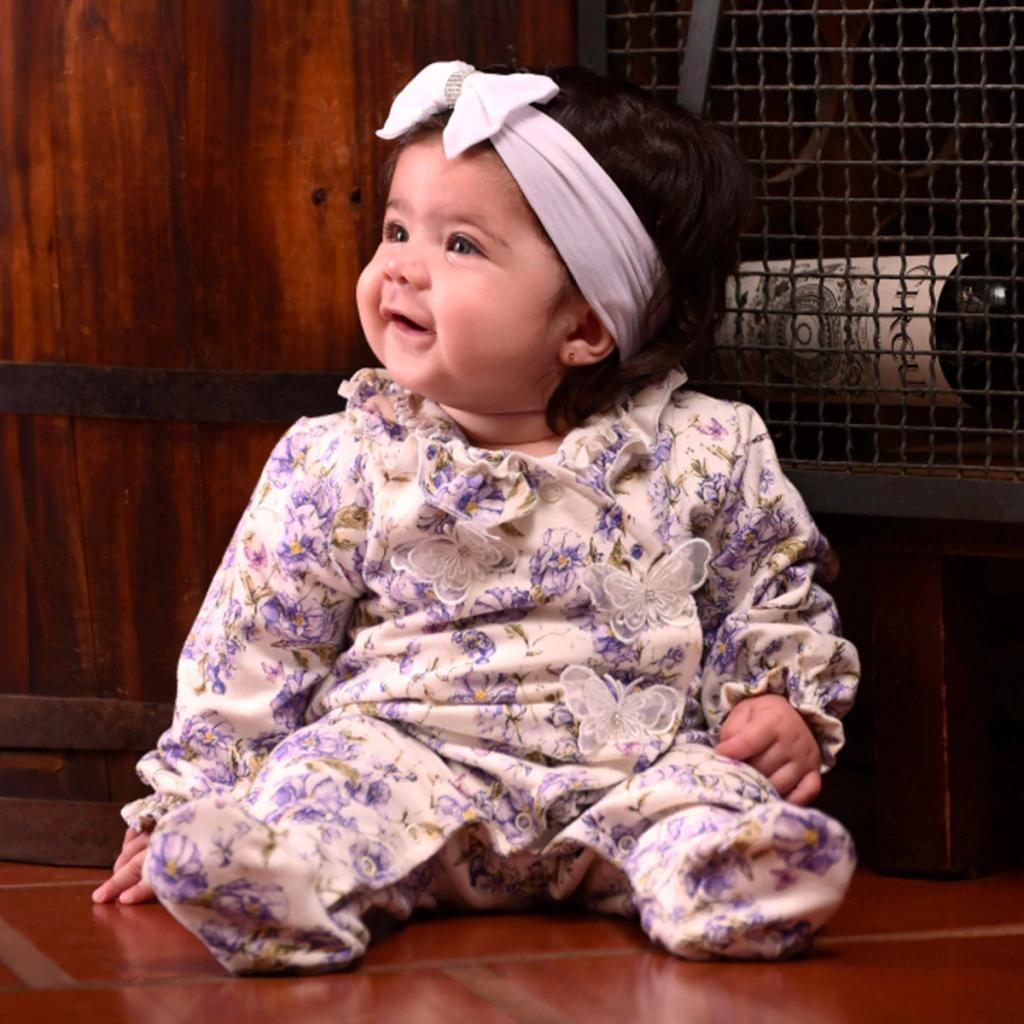 Este macacão lilás é a escolha perfeita para deixar o seu bebê confortável e cheio de charme. Com uma estampa digital floral delicada e detalhes de borboletas, ele combina beleza e suavidade, proporcionando todo o conforto necessário para o dia a dia.