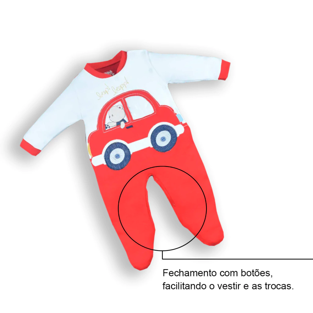 Escolha o macacão vermelho e branco com carrinho bordado para vestir seu bebê com conforto e estilo em todos os momentos.