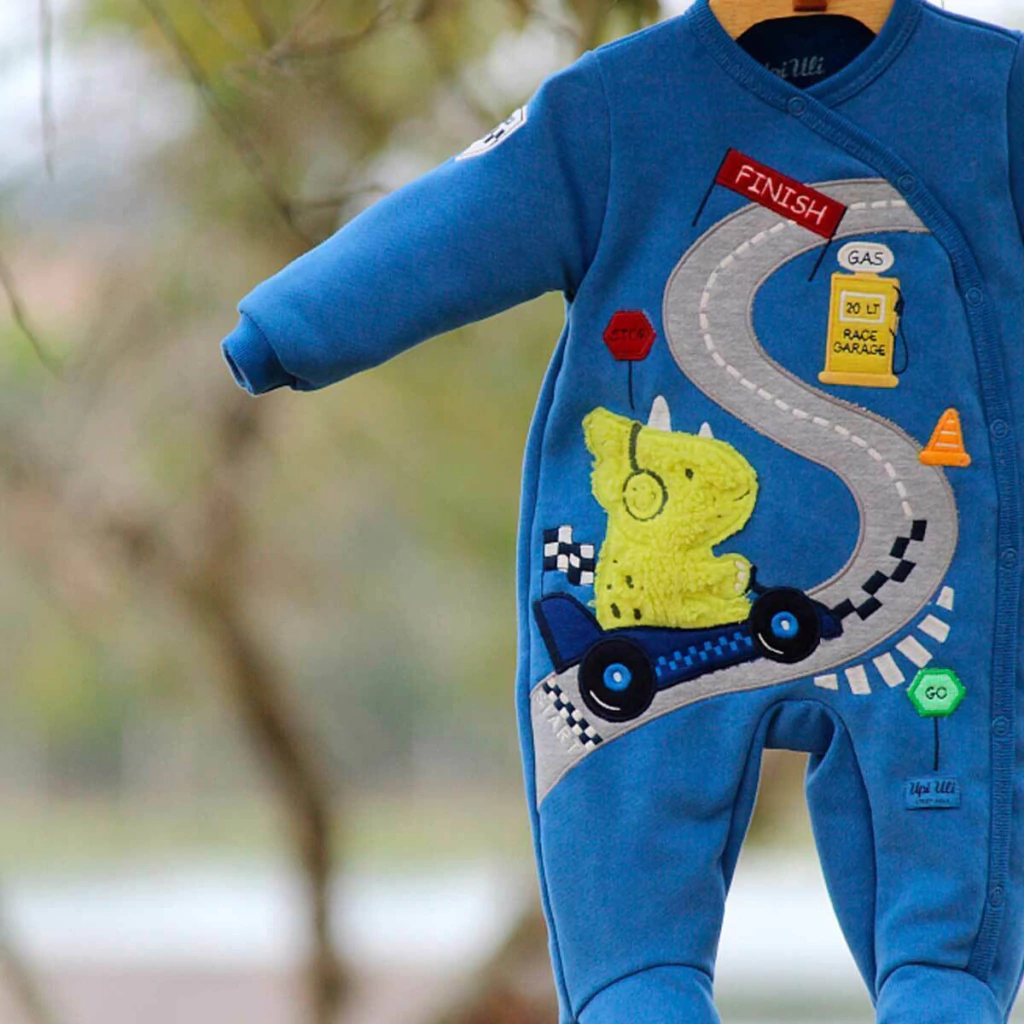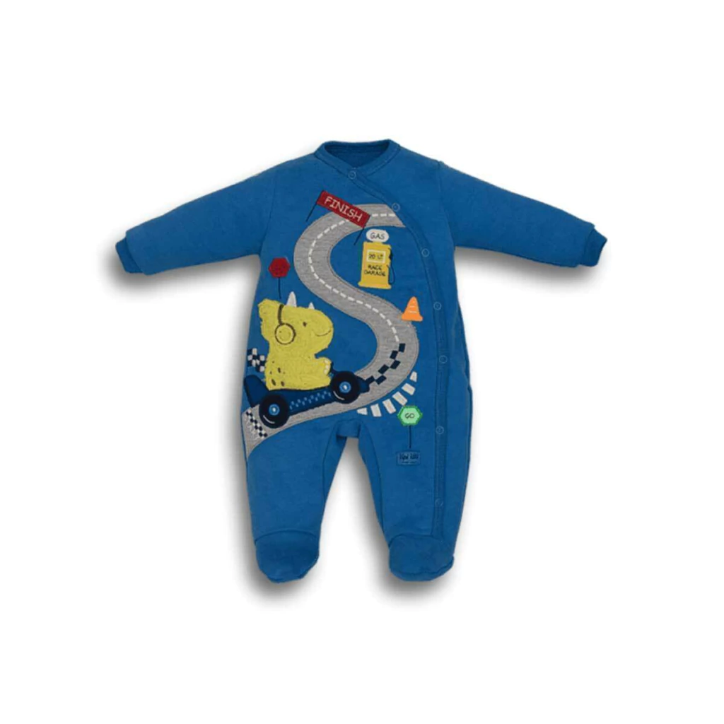 Macacão perfeito para os pequenos aventureiros, com um divertido bordado frontal de dinossauro dirigindo e detalhe de brasão na manga. Confeccionado em moletom 100% algodão, o macacão oferece conforto e aconchego para o bebê. A abertura lateral frontal com botão de pressão garante praticidade no momento da troca. Disponível em tamanhos RN-P-M com pé e tamanho G sem pé.