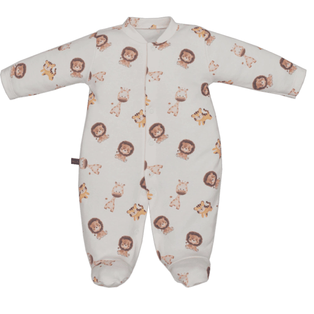 Este macacão infantil na cor marfim, confeccionado em suedine 100% algodão, proporciona conforto e suavidade para o bebê. Com uma encantadora estampa digital de safari, a peça traz um toque de diversão e natureza. A abertura frontal e no fundo, com fechamento por botões de pressão, facilita o processo de vestir. Nos tamanhos RN, P e M, o macacão vem com pezinho, enquanto no tamanho G é sem pezinho.