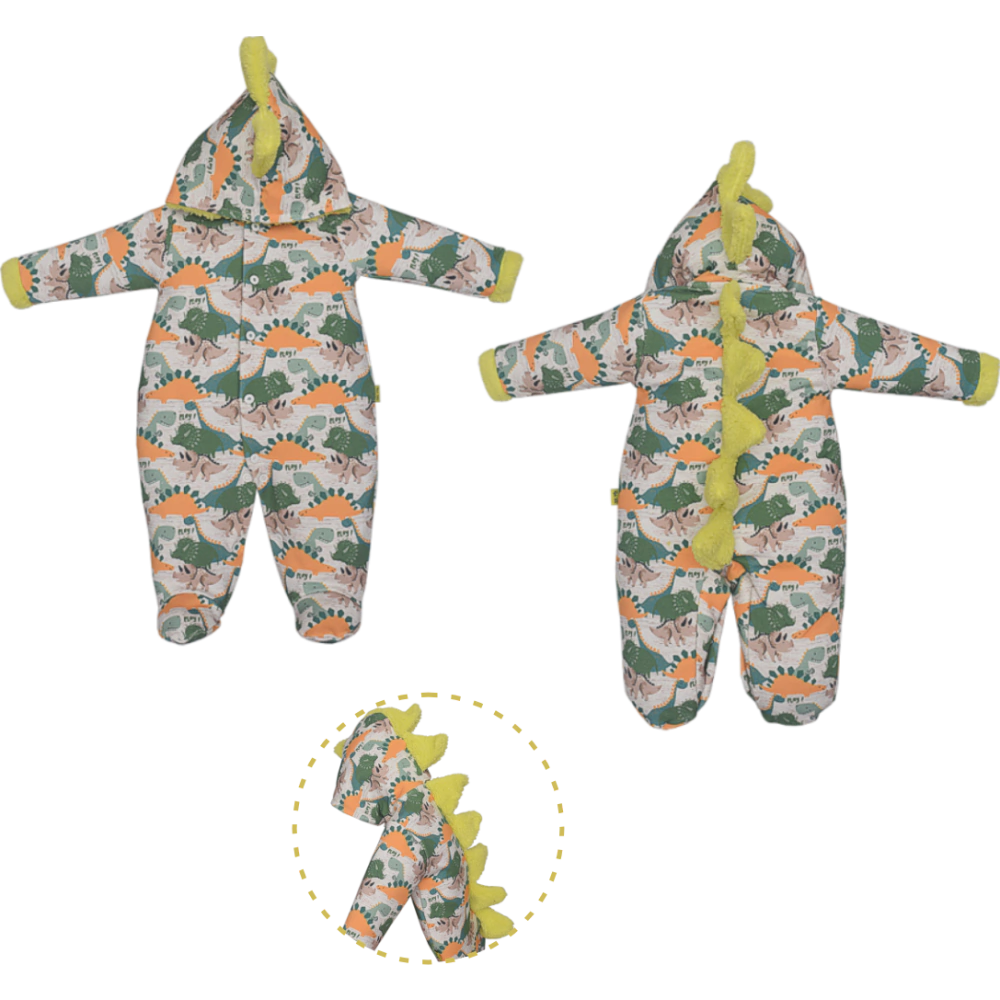 Macacão Dino, perfeito para manter os pequenos aquecidos com um toque divertido. Confeccionado em molecotom, possui tecido macio e quentinho, além de uma touca com forro de pelúcia e detalhes de croco nas costas e na touca, garantindo charme e aconchego.