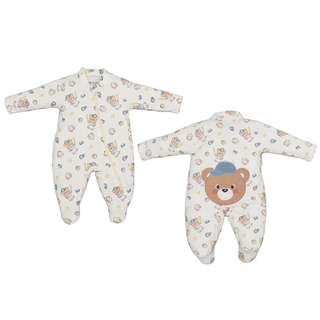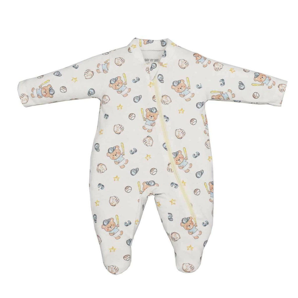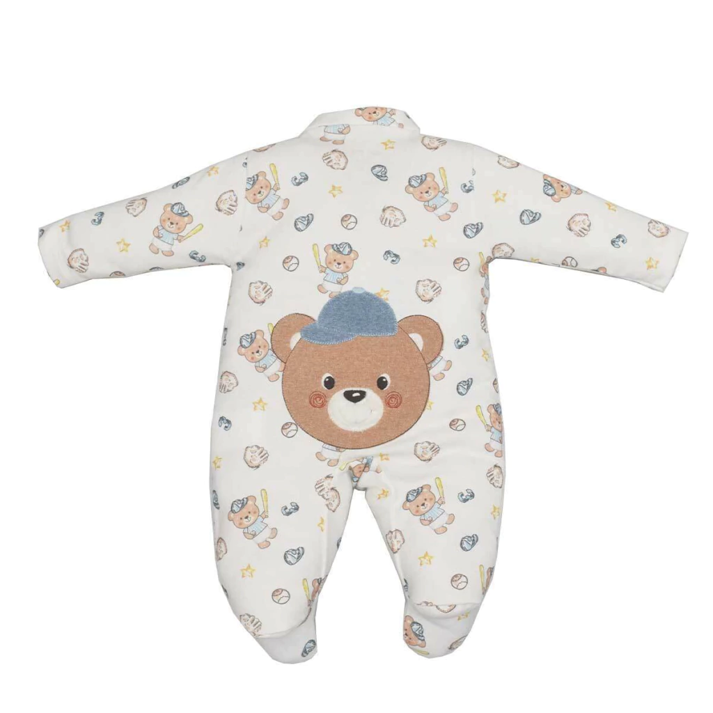 Cor: Fundo off white com estampa de ursinhos e elementos de baseball