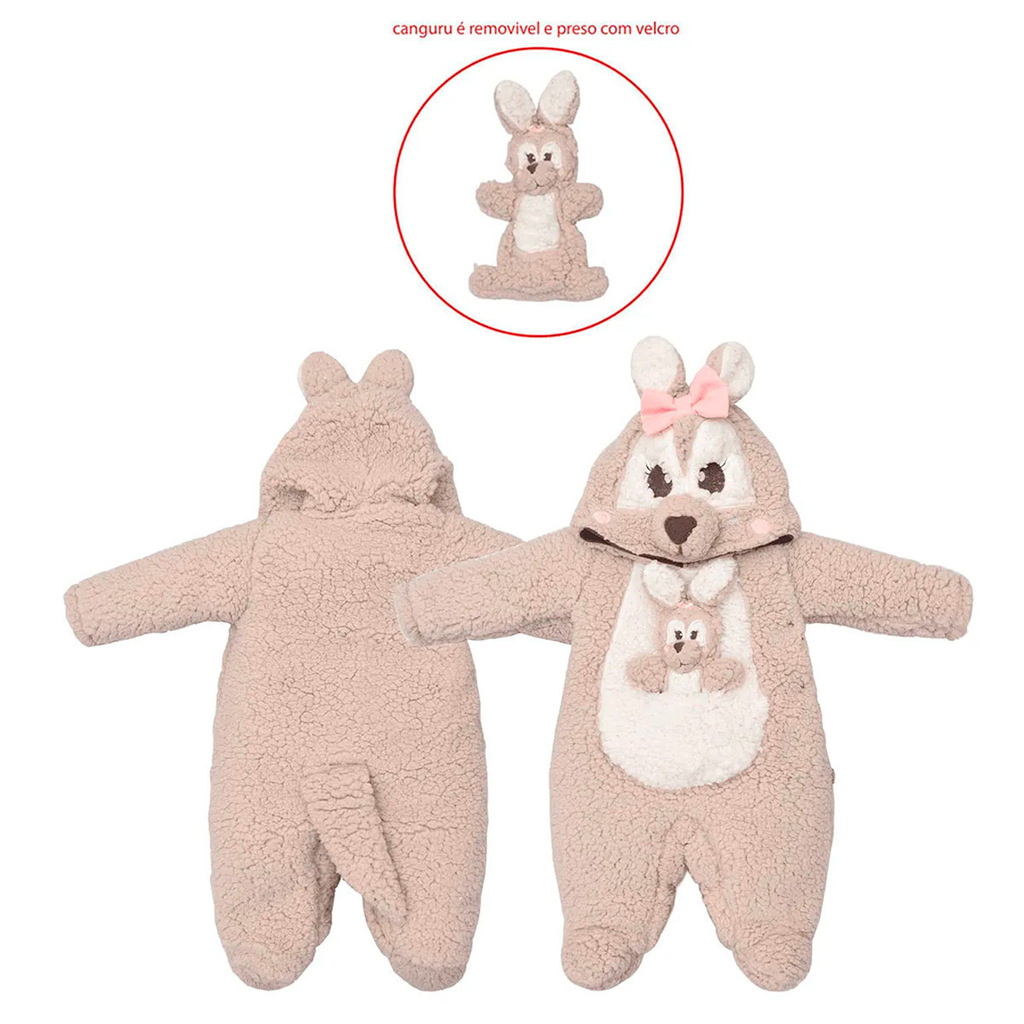 Um verdadeiro espetáculo de fofura para os dias frios! O Macacão de Bebê Gelo Canguru é pura ternura com seu visual divertido e aconchegante. Confeccionado em tecido peluciado tipo carneirinho, ele vem com capuz com orelhinhas, rabinho e uma aplicação em alto-relevo de canguru com um filhotinho no bolso frontal. Detalhes como o laço rosa e o rostinho bordado deixam a peça ainda mais encantadora. Perfeito para manter o bebê aquecido e arrancar suspiros por onde passar!