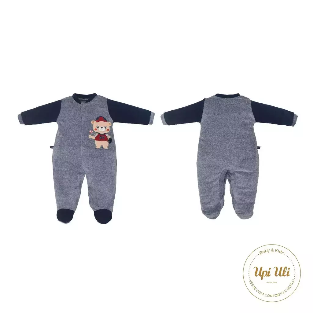 Todo em plush com toque macio, na cor azul jeans, com manguinhas e golinha no azul marinho... Combinação única e perfeita!!!