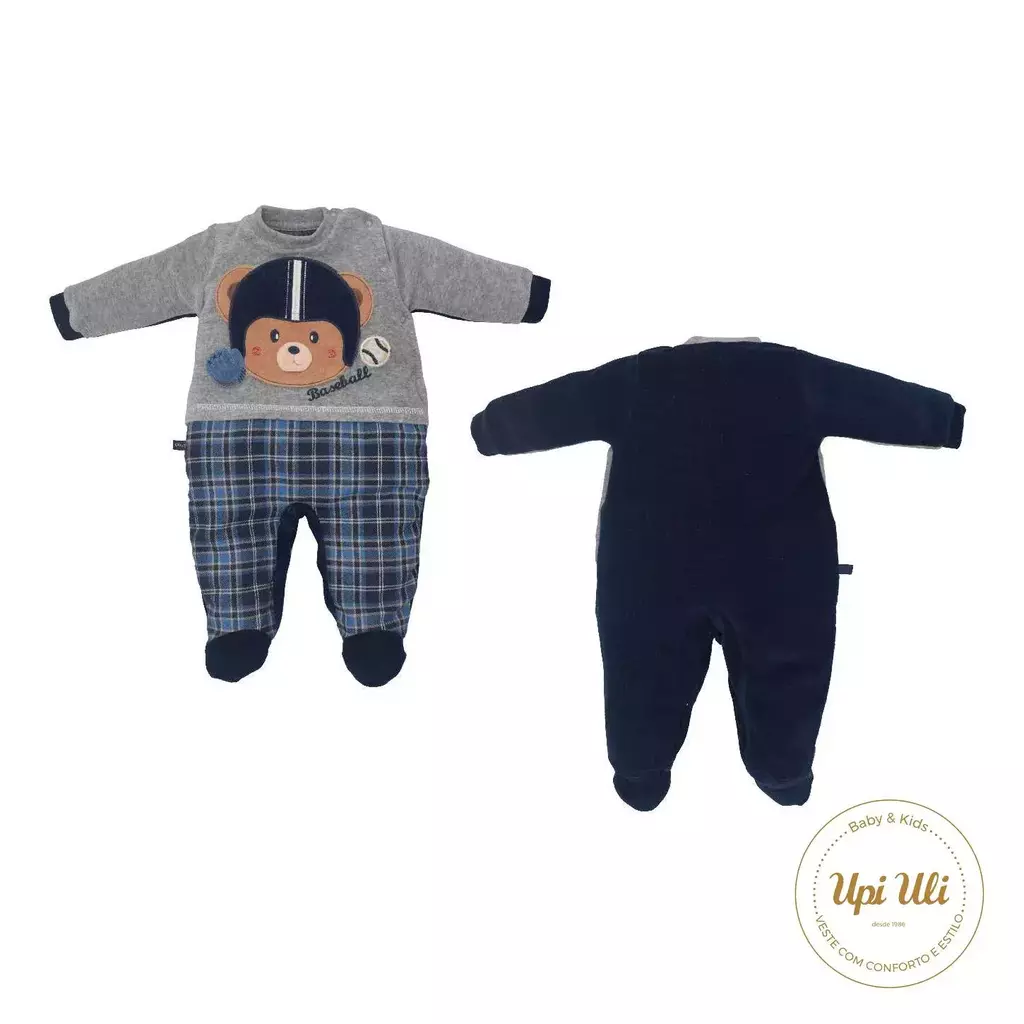 Macacão em plush e suedine, tecido macio e confortável, bordado de ursinho 3d frontal. Mangas e recorte frontal em suedine listrado. Costas e frente em plush com estampa de ursinhos em puff.