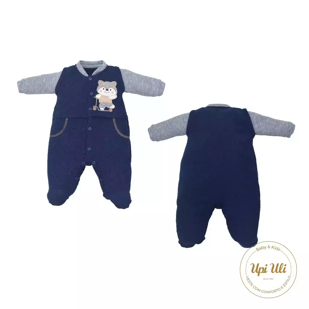Macacão em plush buckle e fleece, no azul marinho e manguinhas no cinza lindooo...