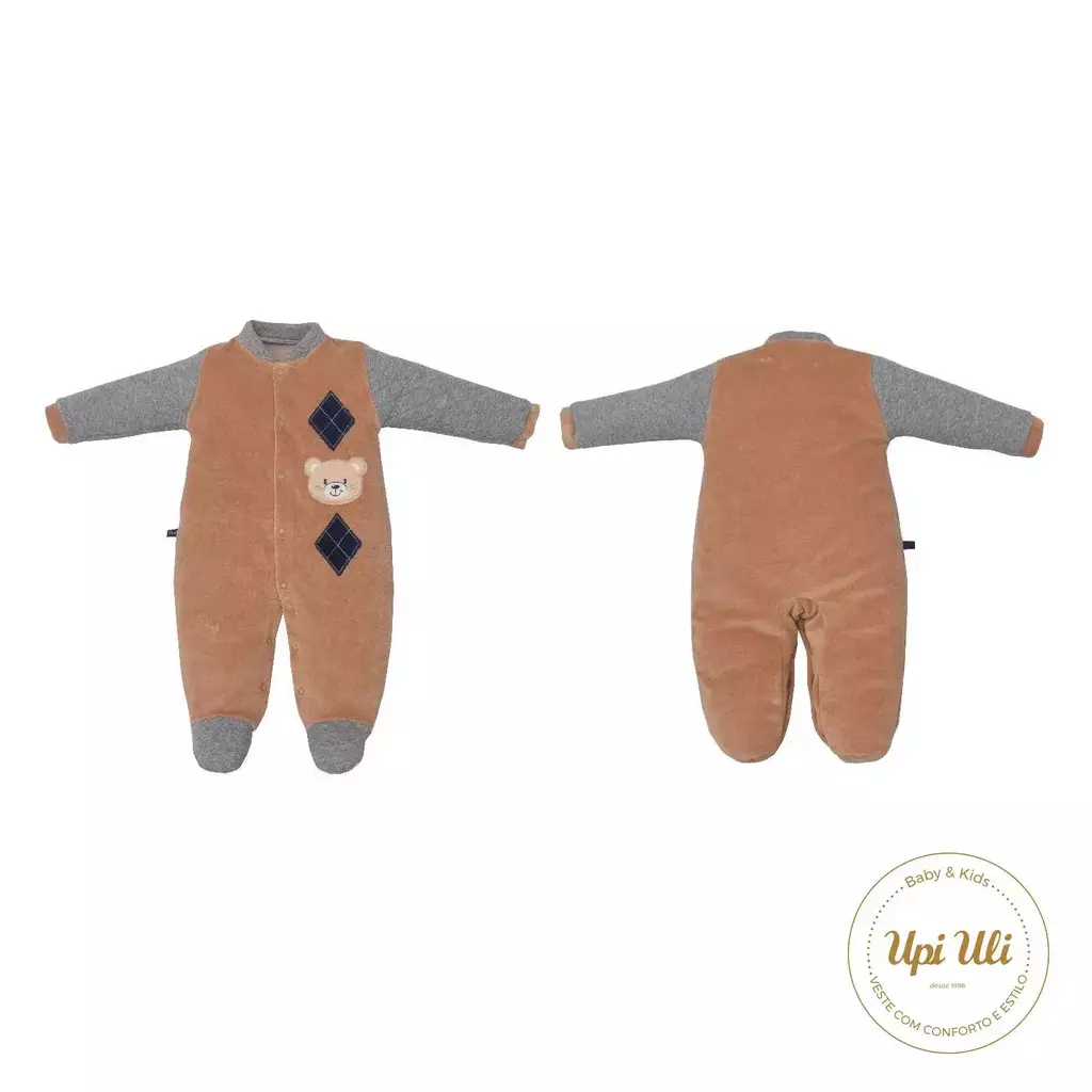Macacão em plush, com bordado dino com estampa em puff 3d. Mangas com com estampa de listras em puff.