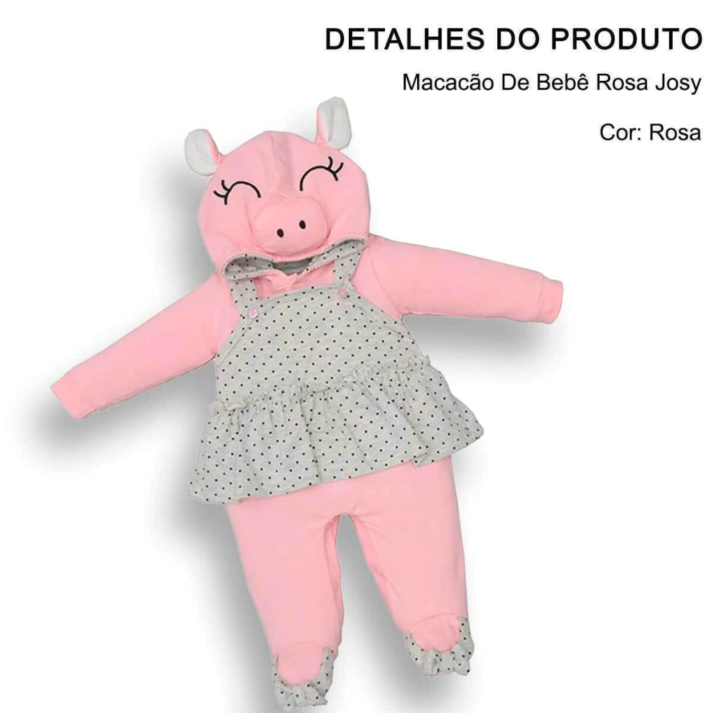 O Macacão de Bebê Rosa Josy é puro charme e diversão para os dias mais fresquinhos. Confeccionado em tecido macio, possui capuz com aplique de porquinha, orelhinhas e bordados em relevo. O modelo conta ainda com sobreposição de babadinho estilo jardineira e detalhes em poá nos pés, tornando a peça ainda mais delicada e encantadora para as pequenas.