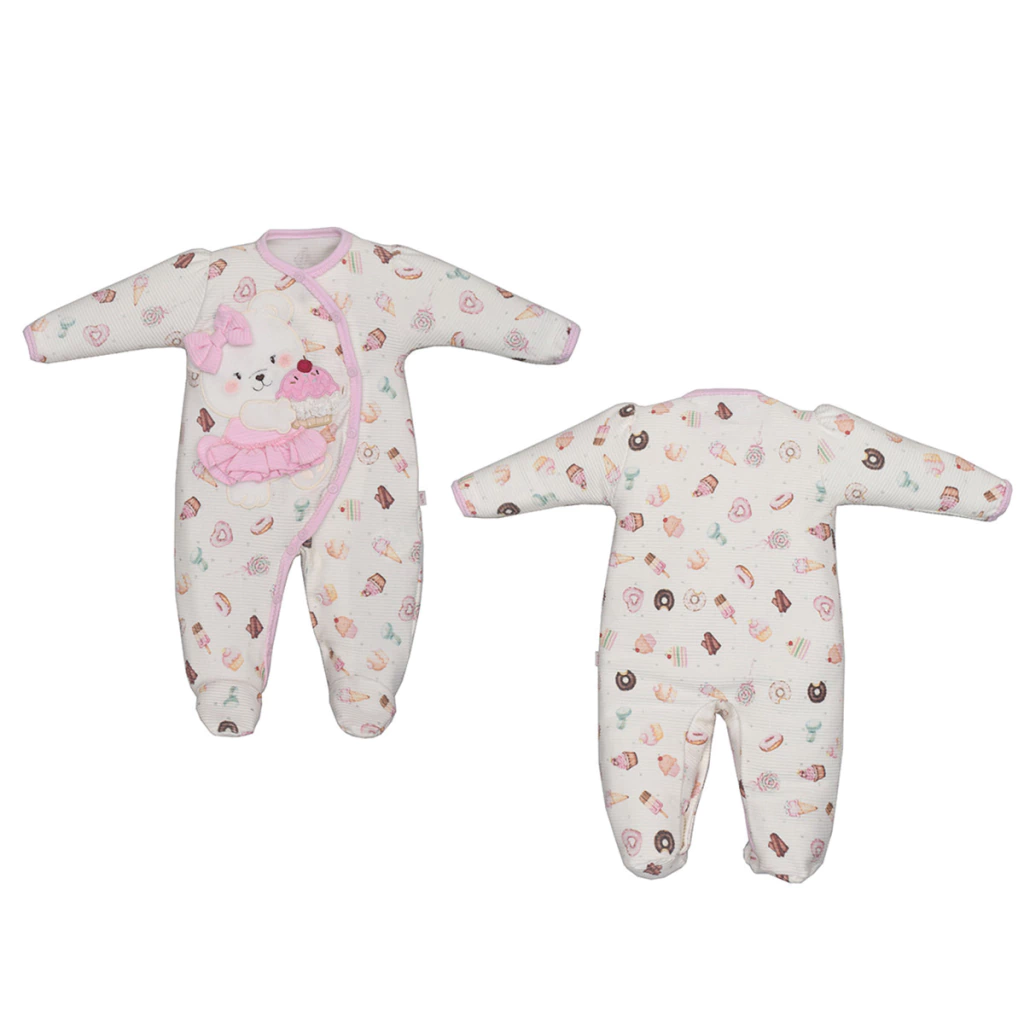 Descrição do Produto: Macacão Infantil Malha Canelada Branco Rosa Urso Alto Relevo