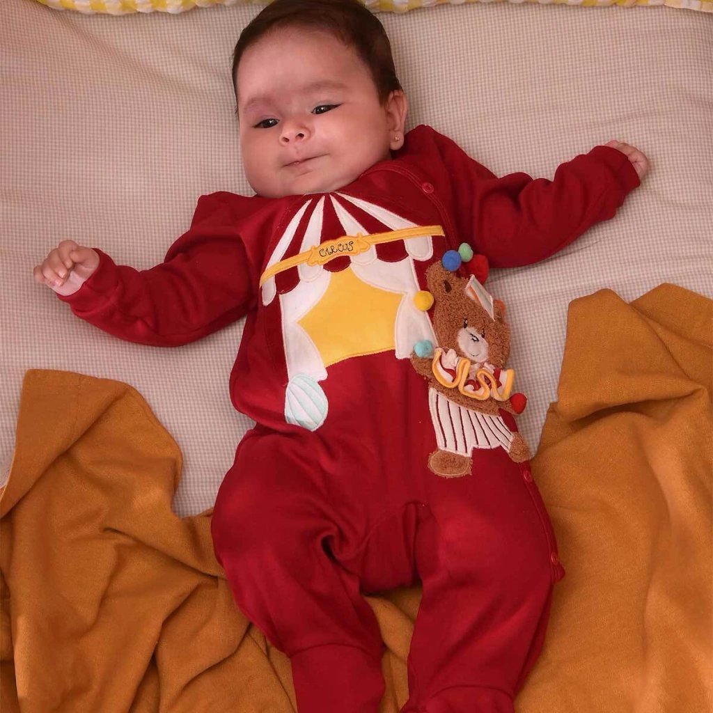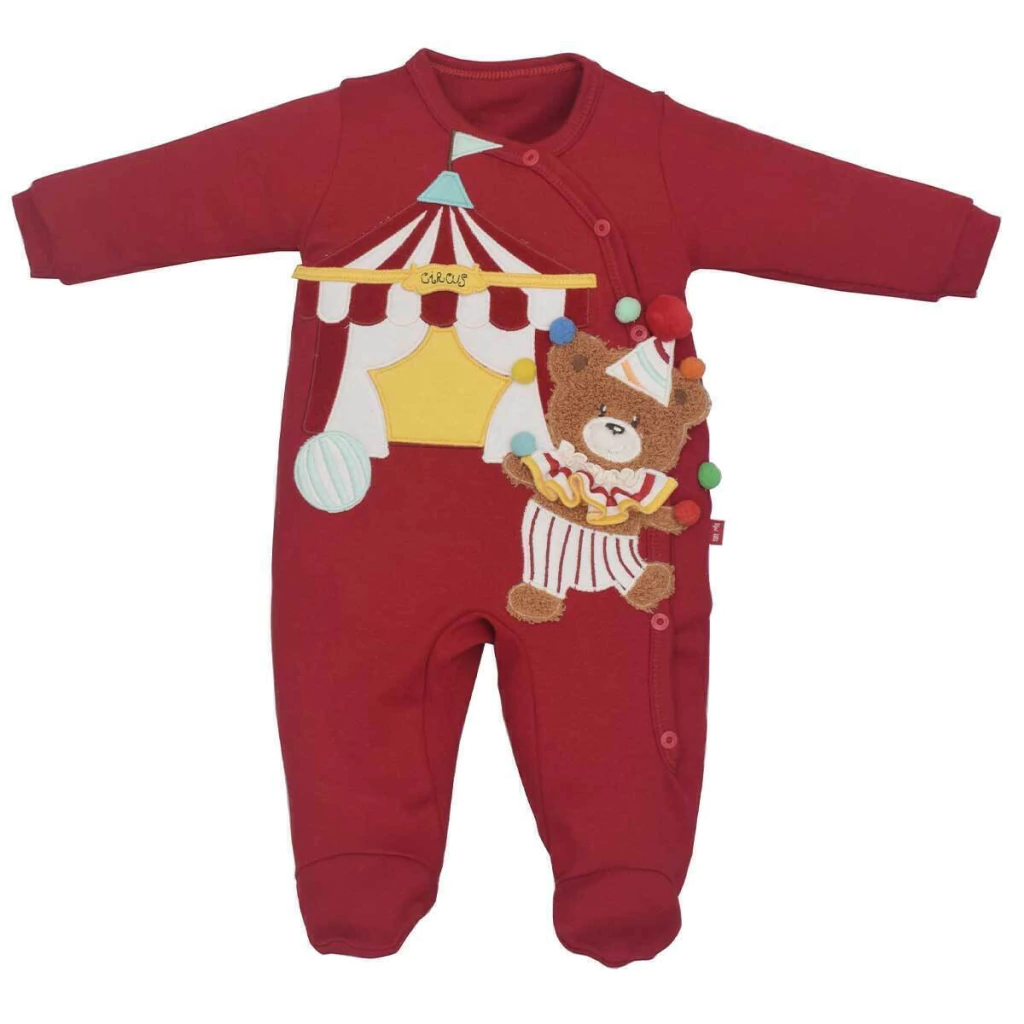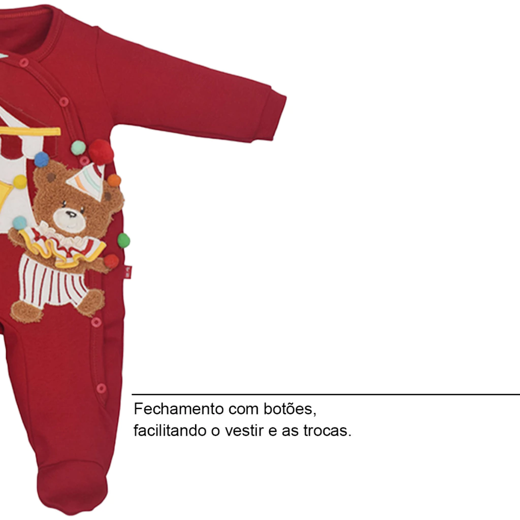 O Macacão Infantil Suedine Vermelho Urso Circo Alto Relevo é perfeito para trazer conforto e diversão ao look do seu bebê, com um design encantador que cativa em qualquer ocasião!