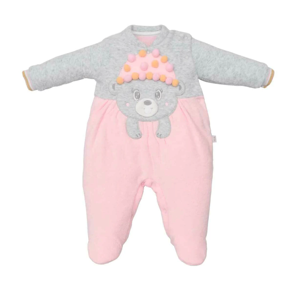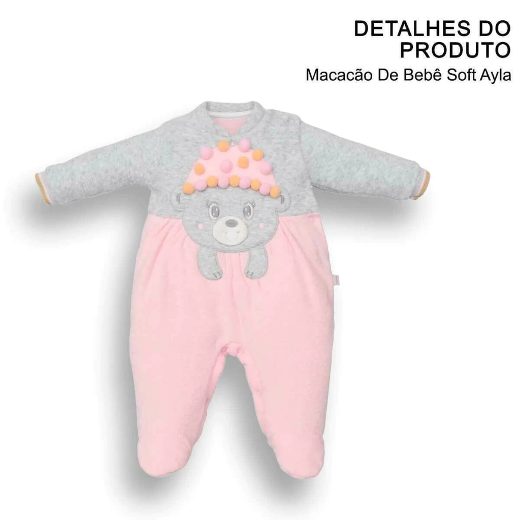 O macacão perfeito para os dias mais frios! O modelo Soft Ayla une conforto térmico, toque macio e um visual encantador. Combinando tons suaves de cinza e rosa, o destaque fica por conta da aplicação de ursinha com gorro decorado com pompons coloridos em relevo, que trazem um charme lúdico irresistível.