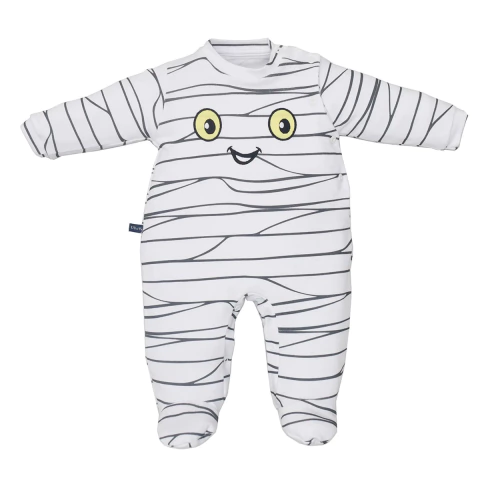 Conforto divertido para o dia a dia! Este macacão branco em suedine é puro charme e conforto para os pequenos. Com estampa digital inspirada em múmias e um bordado delicado no peito com carinha divertida, ele une criatividade e aconchego. O tecido 100% algodão proporciona toque macio e respirável, ideal para a pele sensível do bebê. Fácil de vestir, é perfeito para o uso diário e ainda é unissex, sendo uma escolha prática e fofa tanto para meninos quanto para meninas.