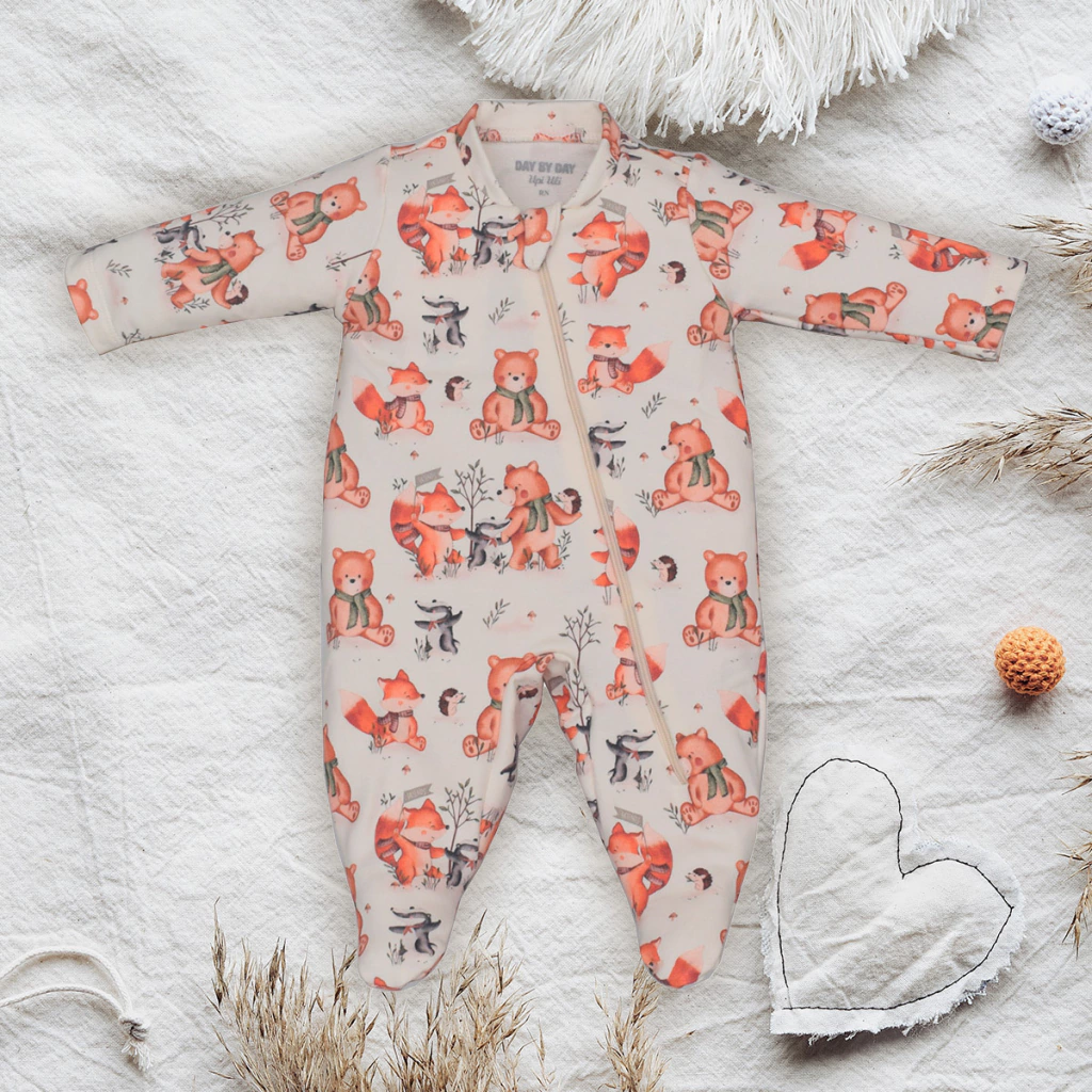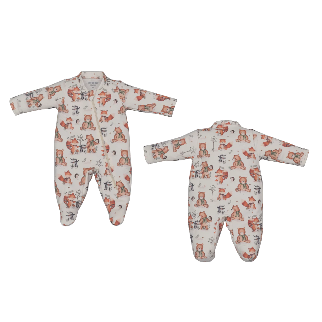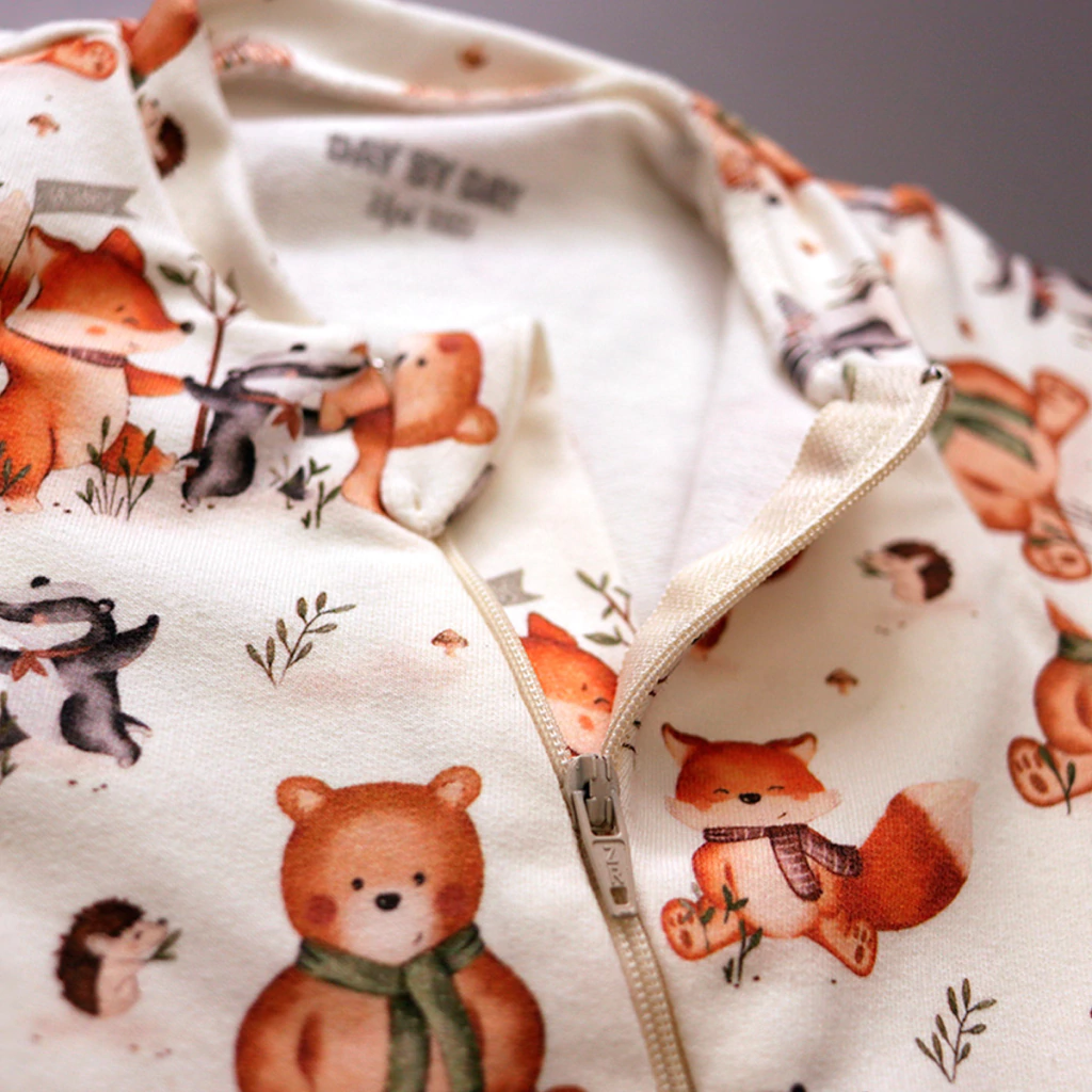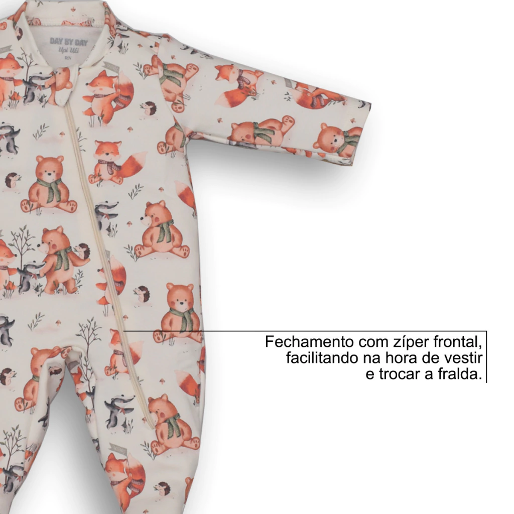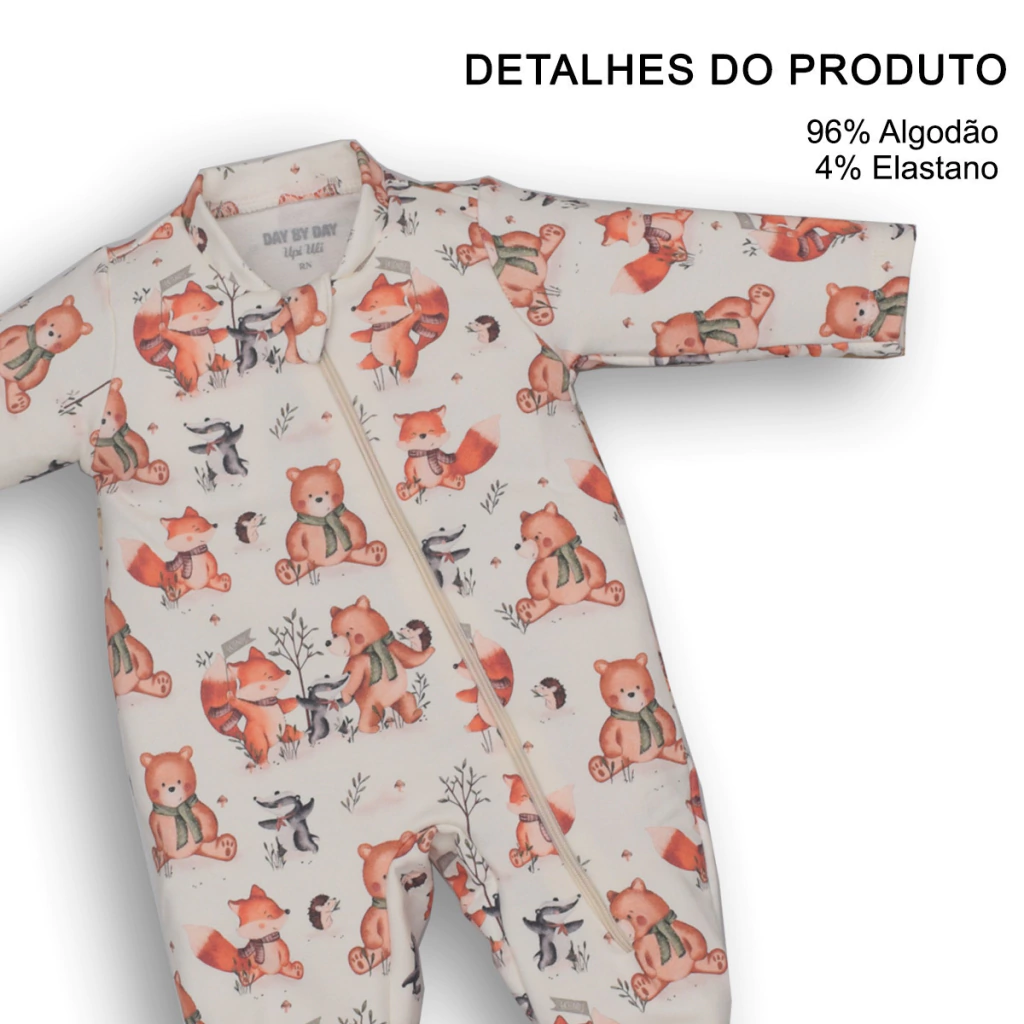 Este macacão encantador traz uma estampa exclusiva de raposas e bichinhos da floresta, ideal para deixar o bebê estiloso e confortável!