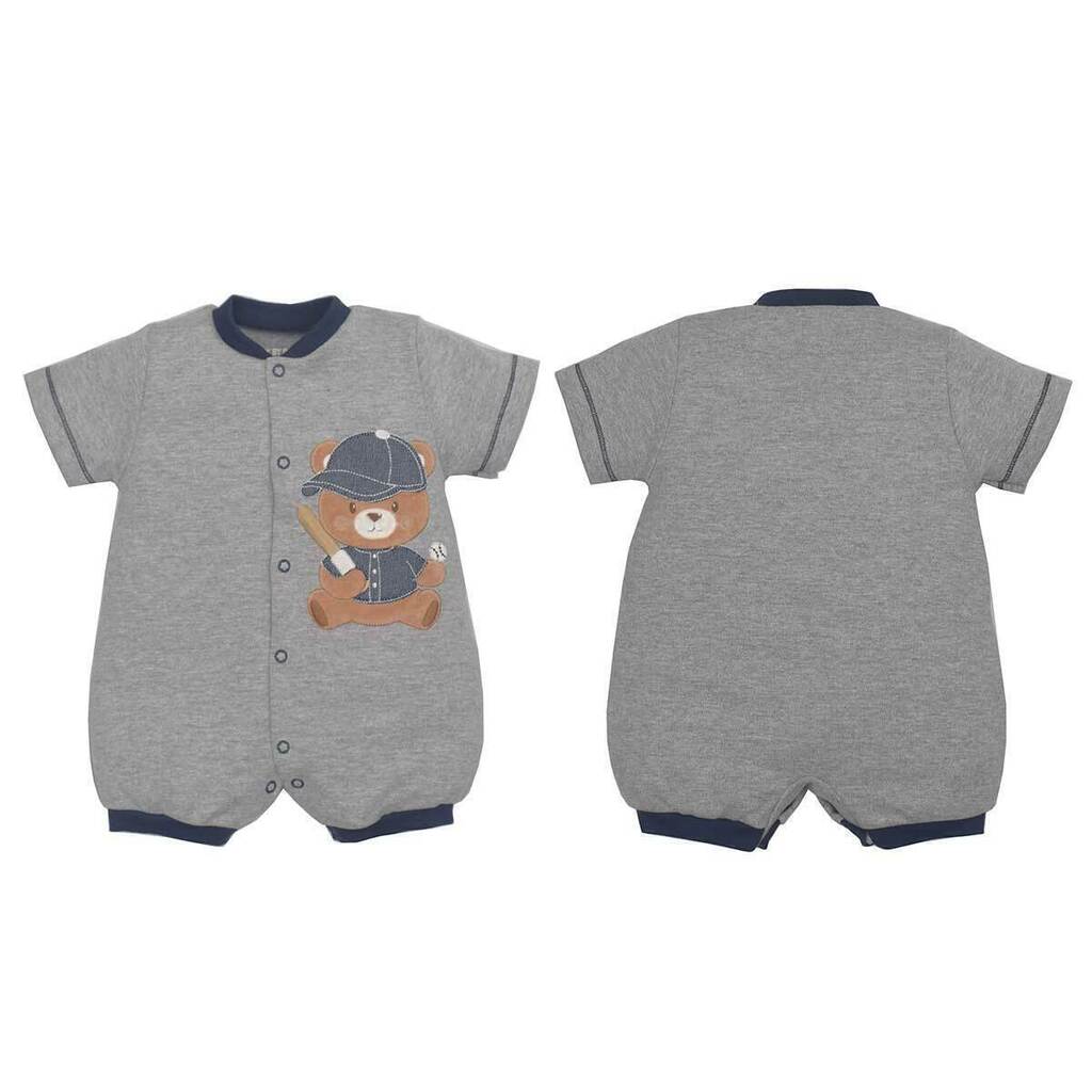 O Macaquinho Suedine Urso Baseball é ideal para dias quentes, oferecendo frescor e conforto com um toque esportivo e divertido. Produzido em suedine leve, ele conta com fundo mescla, aplique bordado de ursinho com boné e uniforme de baseball, além de detalhes em azul marinho que valorizam o visual. Com fechamento frontal por botões de pressão, facilita na hora de vestir e trocar o bebê.