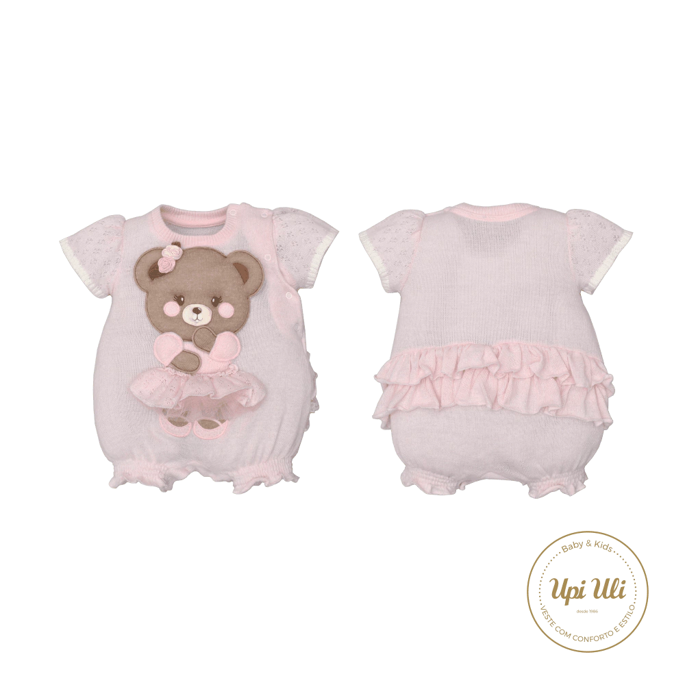 Este encantador macaquinho em tricô é a escolha perfeita para o conforto do seu bebê. Com uma composição macia e confortável de 50% algodão e 50% acrílico, ele apresenta um adorável bordado frontal de uma ursinha marrom em relevo, flores e strass, trazendo um toque de charme. A abertura lateral e no fundo, com fechamento em botão de pressão, facilita na hora de vestir, enquanto o lastex nas pernas garante um ajuste confortável.