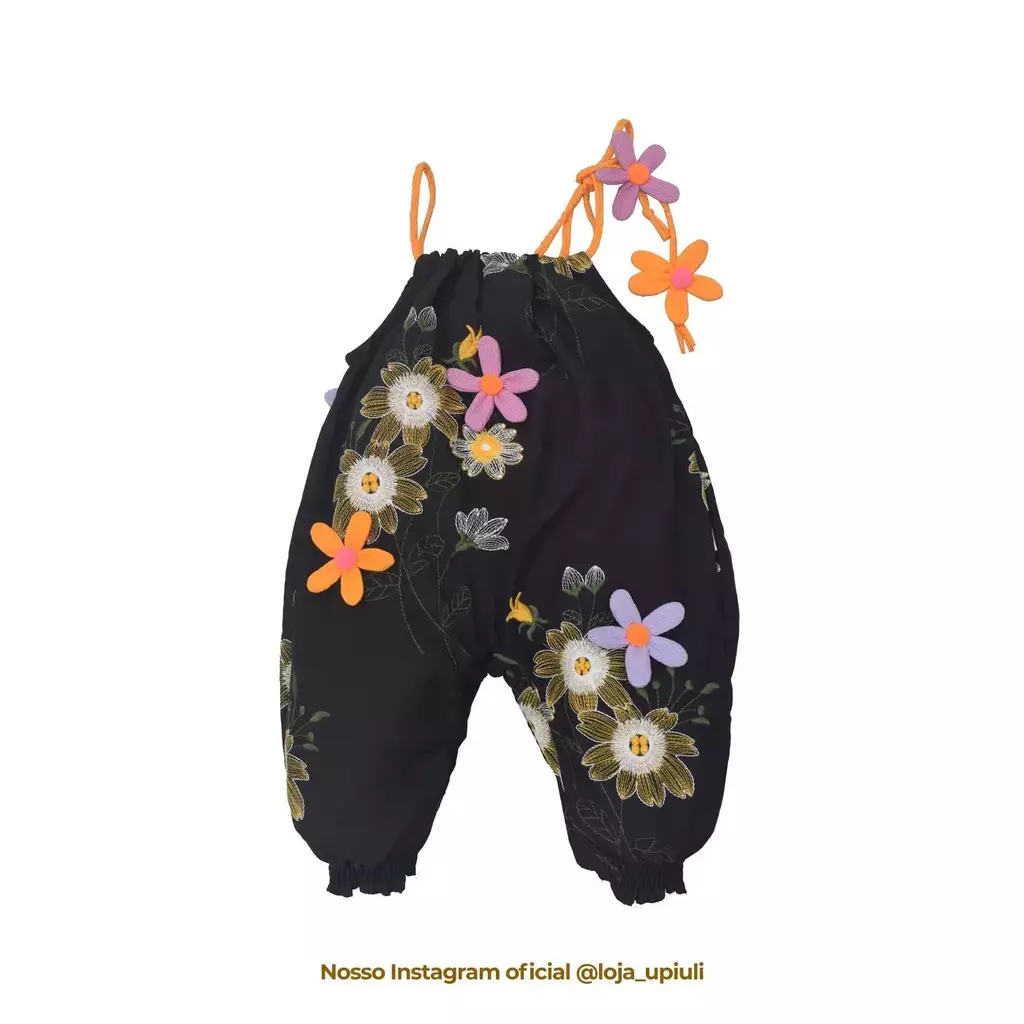 Macaquinho em viscose, todo bordado e com aplicação de flores 3d, com alça em viés trançado, podendo ser ajustado de acordo com a sua preferencia, e detalhes de flores nas pontas do viés.