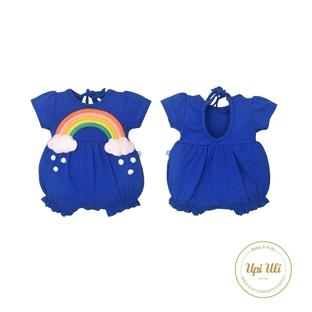 Este macaquinho infantil para meninas é uma peça super fofa e colorida, ideal para os dias mais quentes. Com mangas curtas e um tom azul suave, ele conta com uma estampa frontal delicada de arco-íris com nuvens em relevo, trazendo um toque de charme e alegria ao visual. Confeccionado em algodão, oferece conforto e frescor durante o uso.