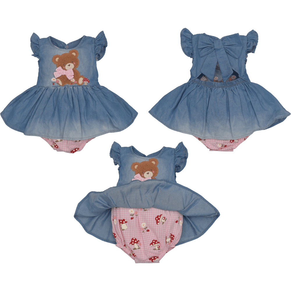 Macaquinho Jeans Bebê Menina Infantil Ursinha Lucila Azul é uma peça versátil e estilosa, perfeita para deixar sua bebê confortável e cheia de estilo!