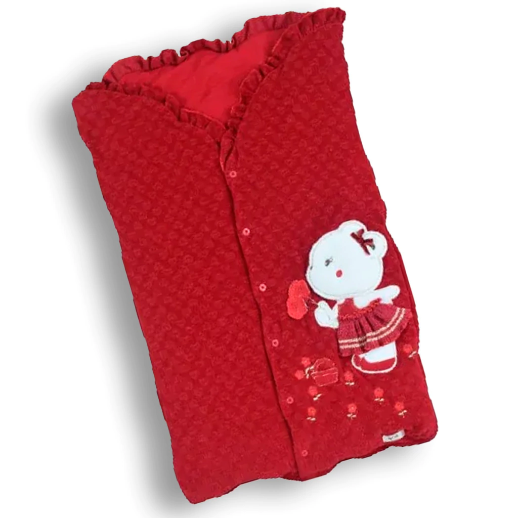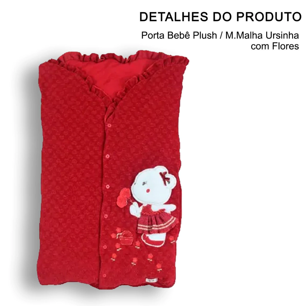 Delicado e funcional, este porta bebê em plush oferece aconchego e proteção nos primeiros passeios do recém-nascido. Com textura macia e forro em malha, ele conta com fechamento prático e um aplique encantador de ursinha com flores, ideal para trazer ainda mais charme aos momentos especiais.