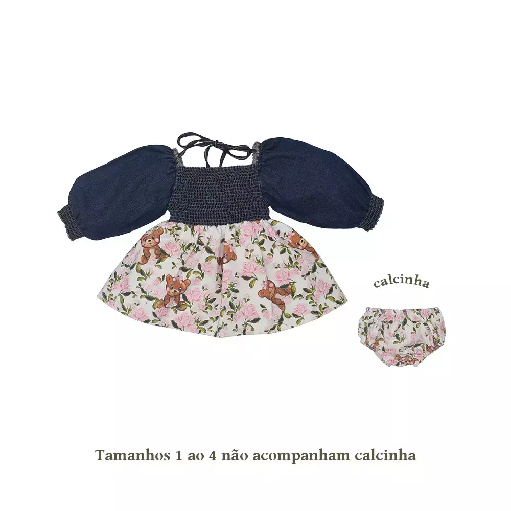 Um toque de delicadeza para todos os momentos da sua pequena! Este vestido Upi Uli traz um visual encantador, sendo na parte superior em jeans leve com elástico smock e mangas bufantes, combinada com saia floral com estampa de ursinhas e flores. Um look encantador para deixar sua pequena ainda mais linda em qualquer ocasião.